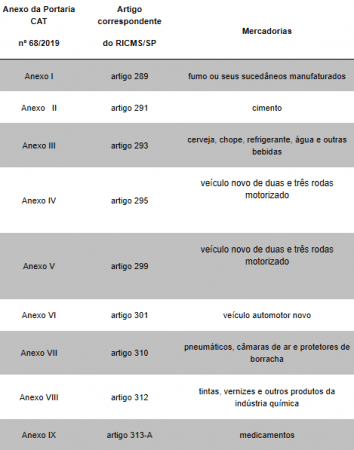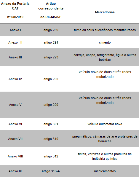 Nesse contexto, a Portaria CAT nº 68/2019, que entrou em vigor em 1º de janeiro de 2020 (publicada no Diário Oficial do Estado de 17/12/2019), apresenta a relação de produtos sujeitos ao regime da substituição tributária no Estado de São Paulo, conforme as descrições das mercadorias constantes em seus anexos: